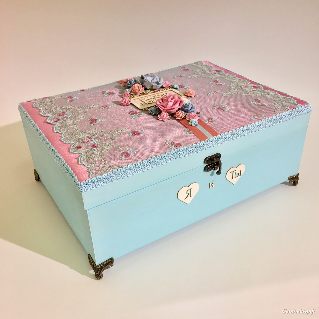 Деревянная шкатулка для денег с замочком,декорированная кружевом,атласными лентами и цветами.