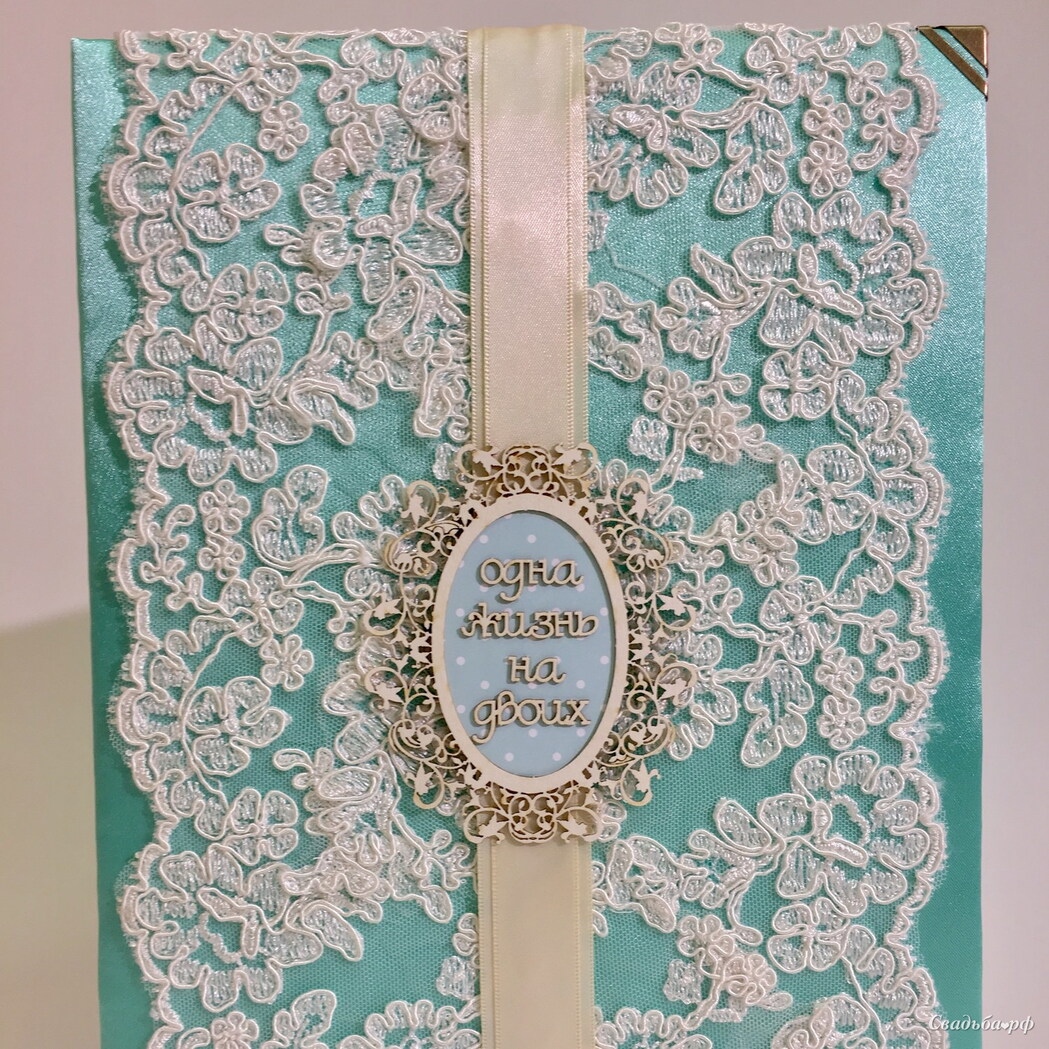Папка для свидетельства о браке «Бархатная мята», декорированная атласом,кордовым кружевом,атласными лентами.Внутри папки для свидетельства предусмотрен файл формата А4.