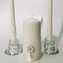 Комплект из трех свечей и трех стеклянных подсвечников,декорированный атласными лентами, кружевом-макраме и жемчужной брошью.