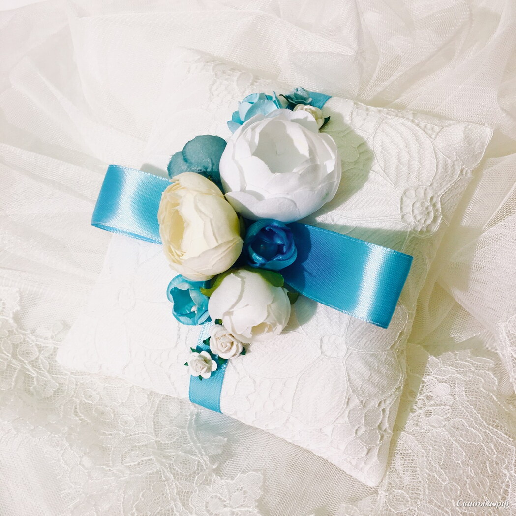 Подушечка для колец «Лазурная»,декорированная нежным кружевом,цветами и атласной лентой.