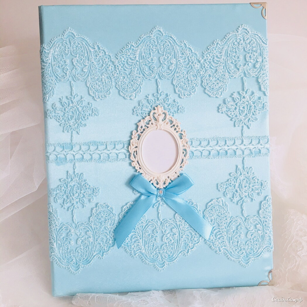 Папка для свидетельства о браке «Лазурная»,декорированная кружевом, атласной лентой и рамкой. Внутри папки для свидетельства предусмотрен файл формата А4.
