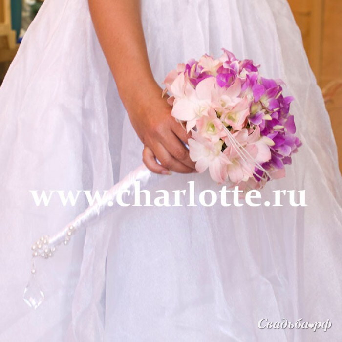 Круглый букет невесты из орхидеи дендробиум, собранный на портбукетнице, с элементами декора. Цветовую гамму орхидей по вашему желанию можно изменить, так же можно изменить ленту, украшающую букет и украшения.