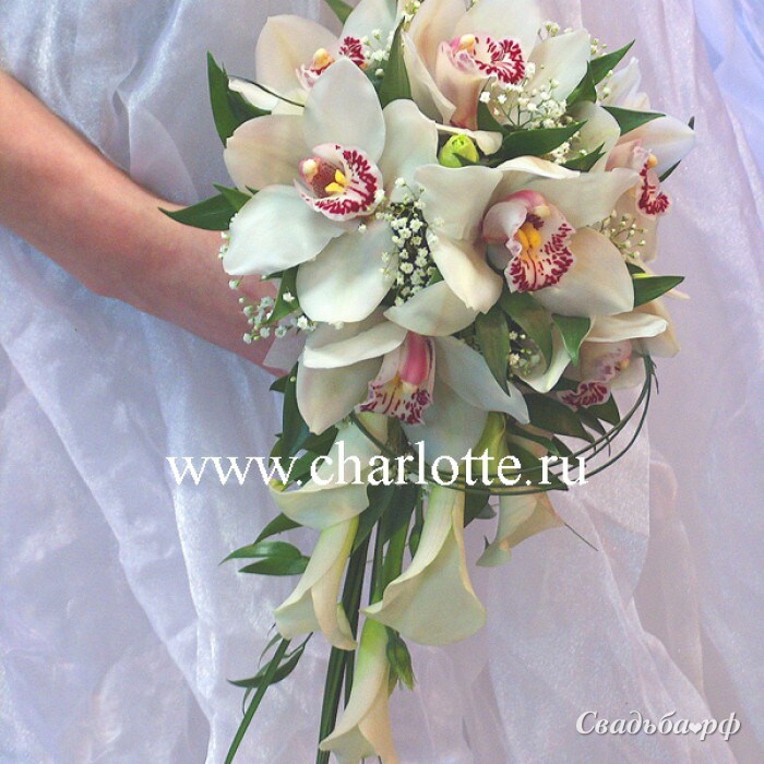 Незабываемый свадебный букет выполнен в форме капли. Его украшают благородные каллы, которые передают глубокую чувственность и роскошные орхидеи.