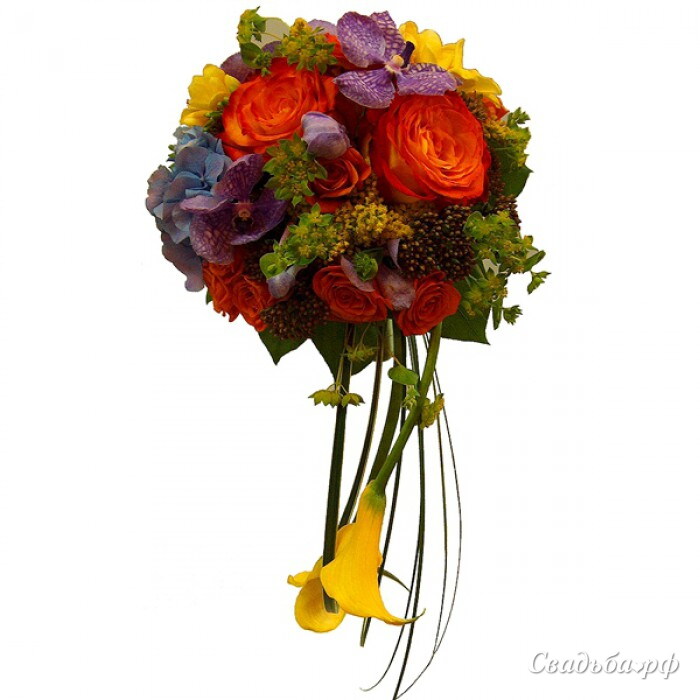 Букет невесты в ярких тонах из роз, орхидей Ванда, фрезий, калл с декоративной зеленью.