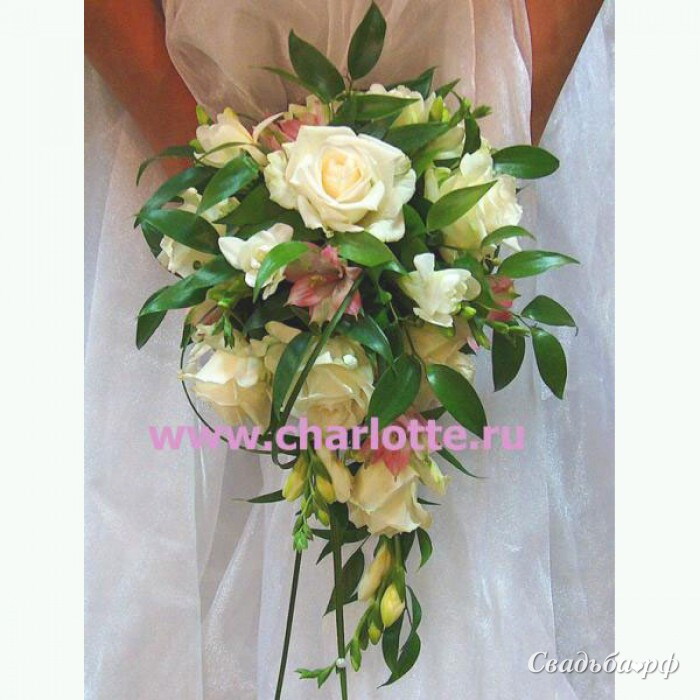 Букет невесты каплевидной формы из кремовых роз и нежно-розовой альстромерии.