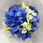 Букет невесты на портбукетнице из голубой гортензии, белых фрезий, декоративной зелени.