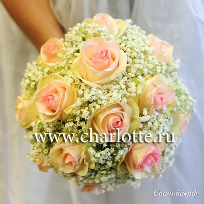 Букет невесты в бело-розовой гамме из роз Федора, гипсофилы. Букет собран на портбукетнице.