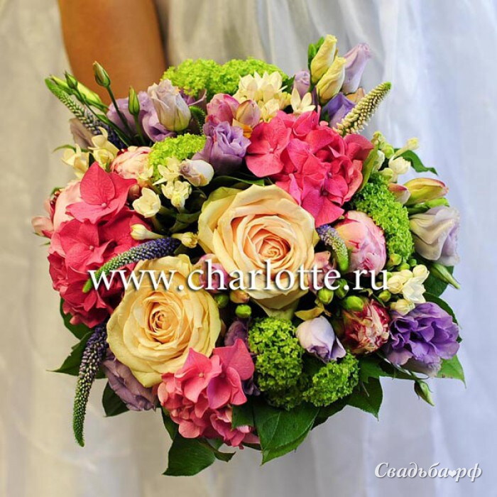 Букет без портбукетницы из ярко-розовой гортензии, нежно-розовых роз, сиреневых лизиантусов, белой бовардии, розовых пионов, сиреневой вероники, белых и розовых фрезий.