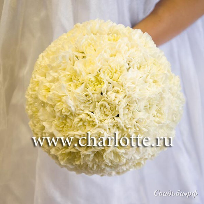 Круглый букет невесты из белой кустовой гвоздики собранный на портбукетнице.