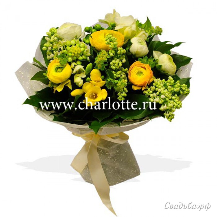 Букет для подружки невесты, в бело-желтой цветовой гамме, из ранункулусов, сирени, фрезий, буплерума.