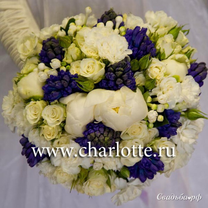 Букет невесты "на свох ногах" из синих гиацинтов, белых пионов, белой кустовой гвоздики, белой бовардии.