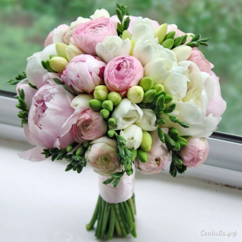пионы Сара Бернар и белые, ранункул розовый, фрезия белая, лента атлас.