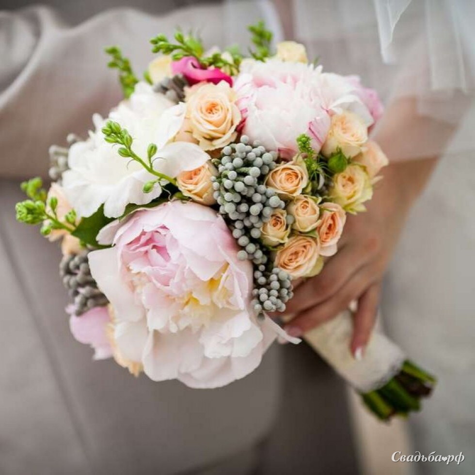 пион Сара Бернар (11), роза кустовая, бруния, лента атлас.