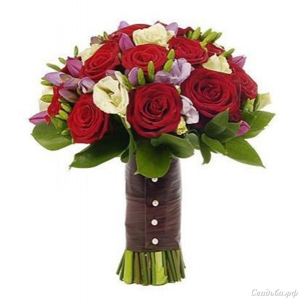 роза гран при 19шт., фрезия 9шт., лизиантус белый 5шт., салал, декор.