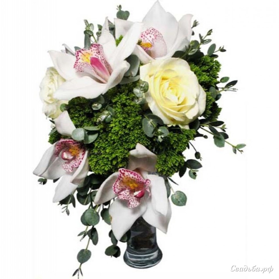 Орхидея цимбидиум 7шт, роза 5шт, трахелиум 5шт, эвкалипт 3шт, портручка 1шт, декор.