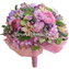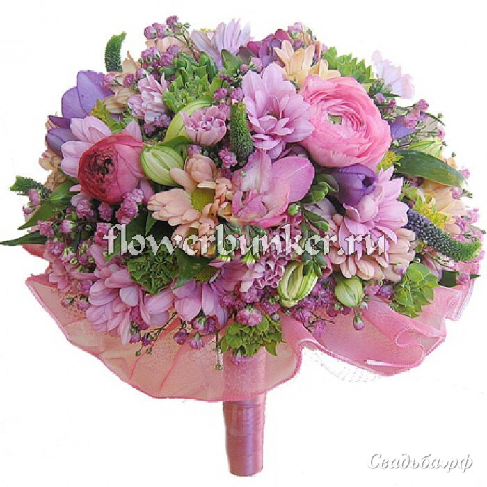 Состав: ранункулюс, вероника синяя, хризантема кустовая (персиковая, розовая, сиреневая), гипсофила крашеная розовая, фрезия сиреневая, альстромерия белая, рускус итальянский, буплерум, портручка.