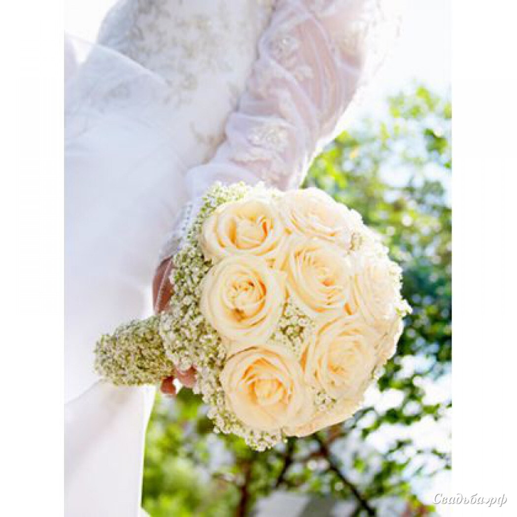 Состав: роза кремовая или розовато-кремовая (15 шт.), гипсофила, порт-ручка, декор.