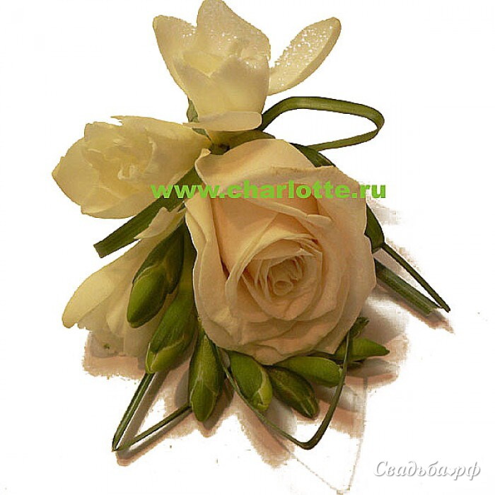 Бутоньерка для жениха из одной розы цвета слоновой кости и фрезии.