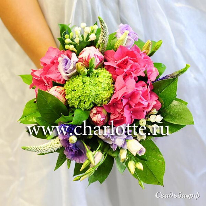 Букет для подружки невесты в ярких тонах из ярко-розовой гортензии, розовых пионов, фиолетовых фрезий, синей и белой вероники, сиреневых лизиантусов, белой бовардии. Букет собран без портбукетницы.