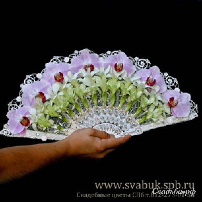 Свадебный букет в виде веера, или веер в виде свадебного букета? Я так и не понял.Невеста пожелала веер.Мы задумались немножко,ведь уже ставшие традиционными букеты-веера представляют из себя громоздкую и далеко не легкую конструкцию.Через час такой громоздкий веер нужно держать двумя руками,а 'тихонечко им обмахиваться' может только чемпион армреслинга.