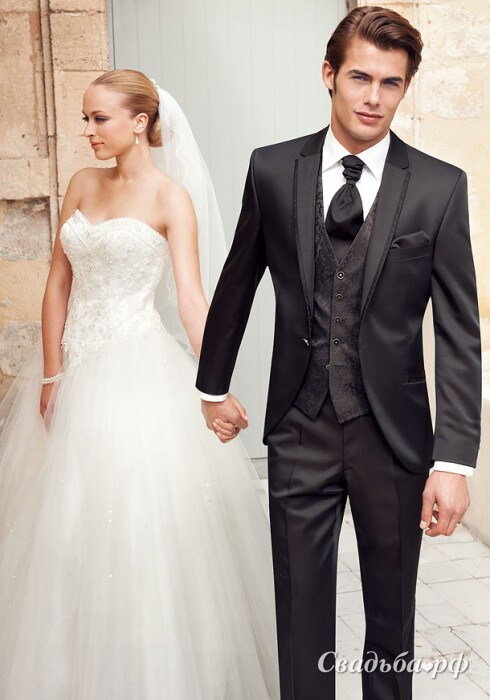 Элегантный свадебный костюм итальянского кроя. На одну пуговицу, с одной шлицей. Декоративная отделка по лацкану пиджака в тон жилета и пластрона.