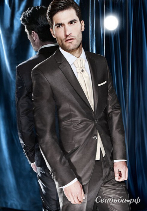 Элегантный свадебный костюм итальянского кроя. На две пуговицы и двумя боковыми шлицами. Декоративная отделка по лацкану и борту пиджака. Облегающий силуэт.