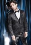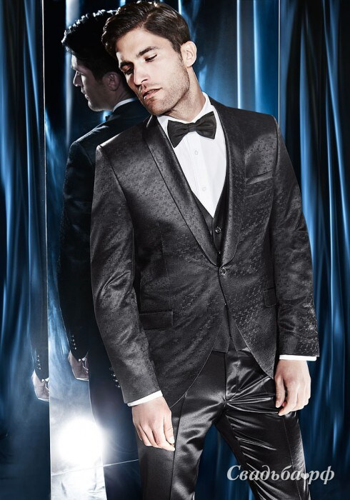Элегантный костюм итальянского кроя вдохновлен классическим смокингом. Жаккардовый пиджак с шалевым воротником на одну пуговицу, с одной шлицей, дополнен гладкими брюками и жилетом.