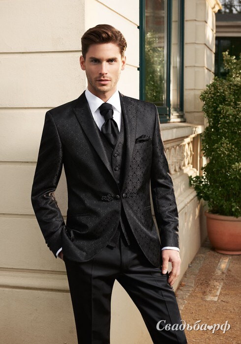 Жаккардовый пиджак на одну пуговицу и с одной шлицей. Дополнен жаккардовым жилетом и однотонными брюками и пластроном.