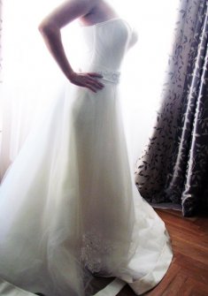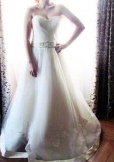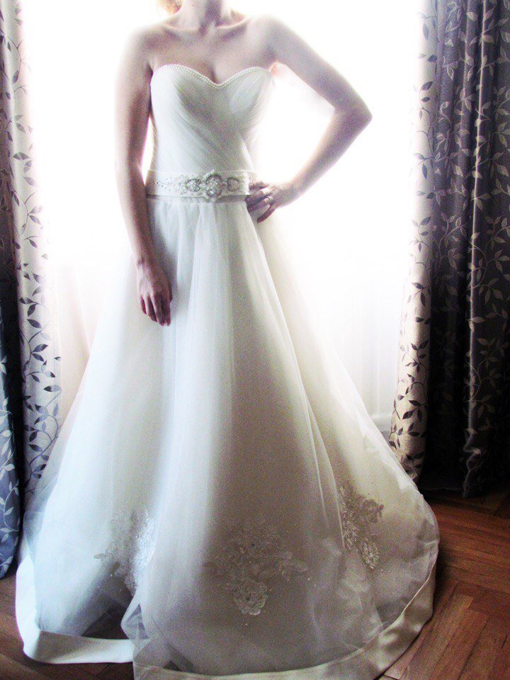 Новое платье с биркой, цвет айвори, размер 42-44-46. На фото не затянут корсет. Очень элегантно смотрится, Вышивка ручной работы. Кринолин на одно кольцо. Примерялось 1-2 раза, на свадьбу не использовалось. Подвязку с голубой лентой отдам в подарок.