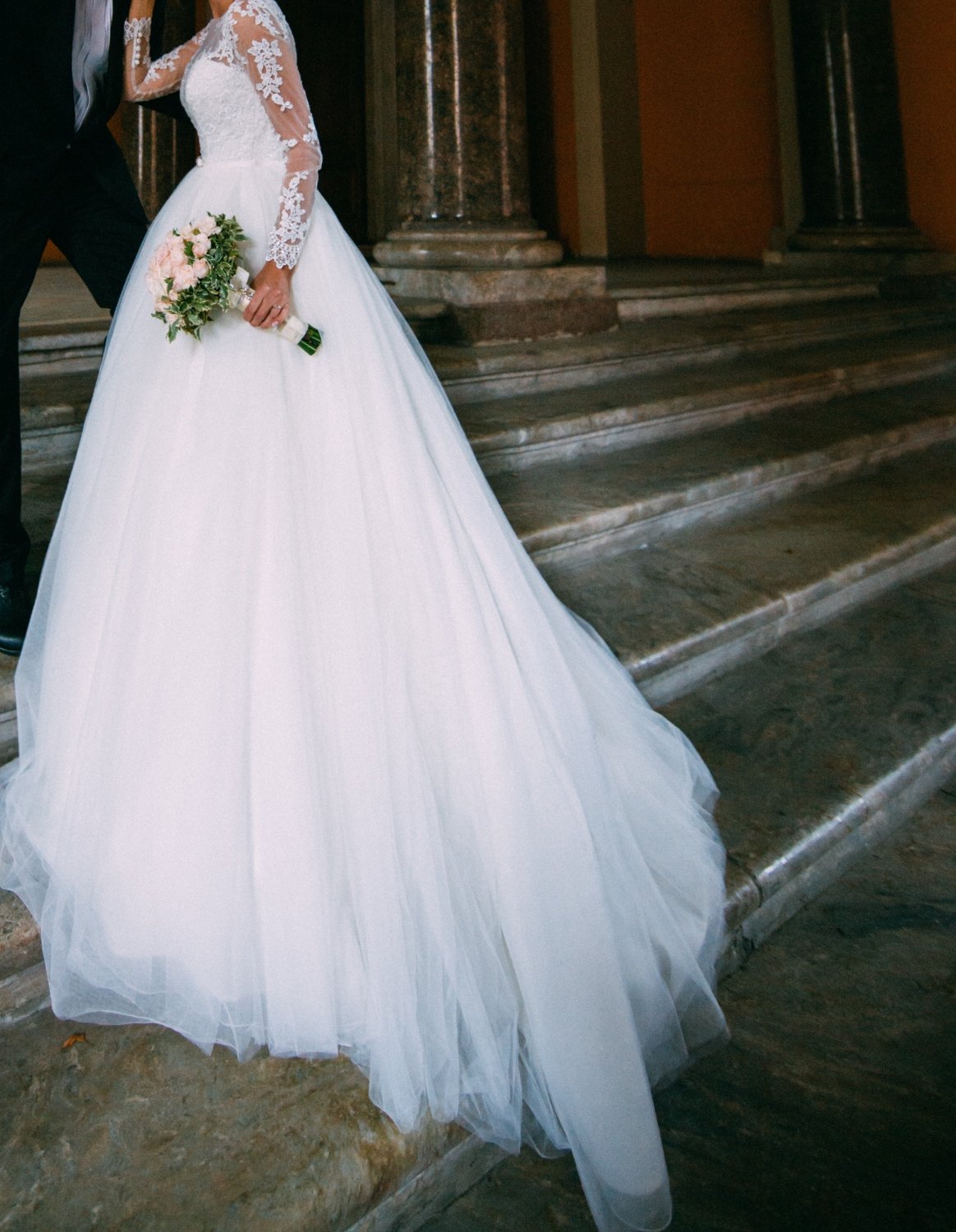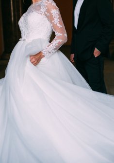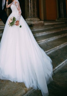 Продам свое счастливое, шикарное свадебное платье известной американской фирмы NAVIBLUE. Цвет айвори, размер 42-44.Верх кружевной,пуговицы покрыты нежным атласом,юбка выполнена из множества слоев легкого шифона, сзади складывающихся в роскошный шлейф,который по желанию пристегивается к пуговицам.Весь день и вечер я в нем была королевой.Платье легкое и комфортное-это ощущается с первой минуты, танцевать в нем одно удовольствие.Платье в отличном состоянии.