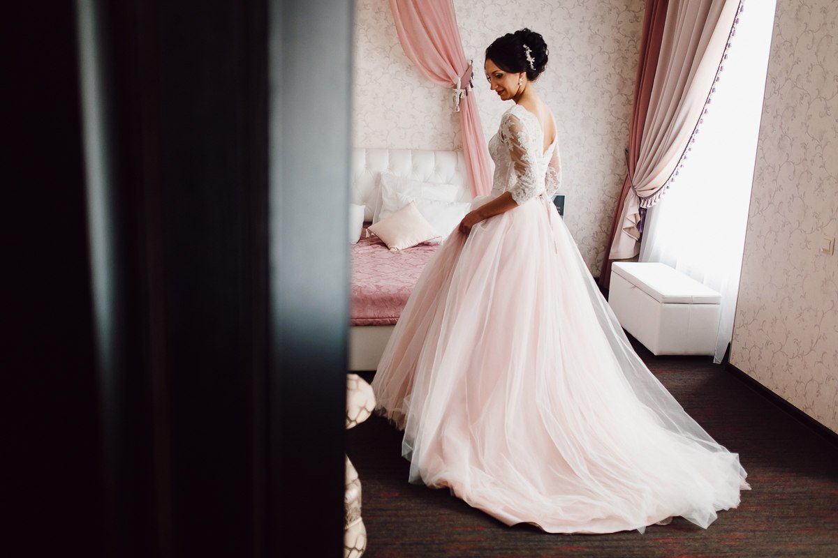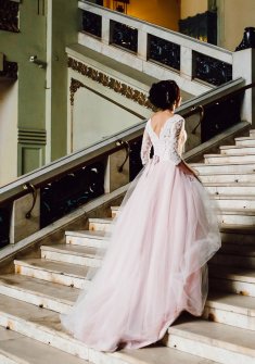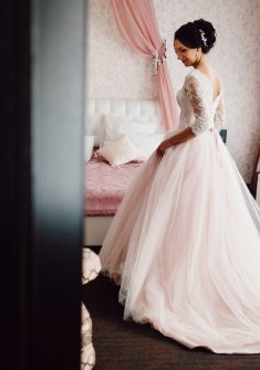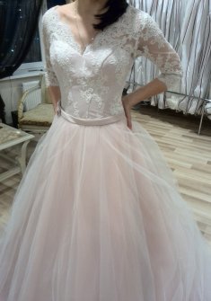 Пудровый цвет делает образ очень нежным, воздушным и неотразимым! Корсет удобный (молния + шнуровка) - очень стройнит, в нем комфортно - за день совершенно не устала. В грудь вставлены чашечки пуш-ап (размер 2-3). V-образный вырез, рукав ¾, небольшой шлейф (30 см), можно пристегивать на петельку. Состояние отличное, после химчистки. В подарок отдам кринолин на 3 кольца, фирменный чехол.
