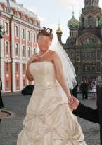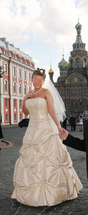 Шикарное платье американской фирмы Mary's. Куплено в салоне Интерстиль, после итальянской химчистки. Цельнокройное. Корсет расшит бисером и пайетками, также расшита сумочка и отделаны сборки юбки. На грудь до 4 размера включительно, рост с каблуками до 172 см. А-силуэт, цвет шампань, невероятно искрит на солнце, шлейф убран, можно расколоть. В подарок к платью: палантин, сумочка, подвязка голубого цвета( новая), подъюбник