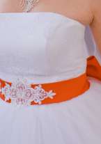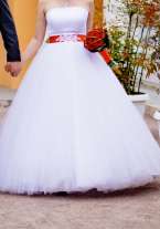 Свадебное платье, одето один раз. После химчистки. Карсет-вышивка, юбка-фатина, бант и лента красного цвета. Размер 44-46. Цвет белый. Карсет чуть завышен подойдет беременным девушкам, чтоб не давил на животик. Торг уместен.