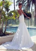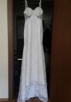 Продам новое свадебное платье, белого цвета, размер 44-46, спина открытая, на лямках, сзади молния. Платье не перешивалось, шлейф, все кружевное.