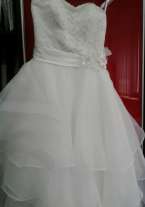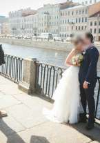 Воздушное свадебное платье очень светлого оттенка айвори. Шлейф, который можно пристегнуть в виде кринолина сзади, а можно отпустить как полноценный шлейф (небольшой). Бюстье не твердое, но отлично держит форму. Платье объемное за счет разноуровневых легких воланов. Легкое. Куплено в 2014 г. в салоне Орхидея на Петроградке в Санкт-Петербурге, надевала один раз. Платье после химчистки в чехле.