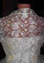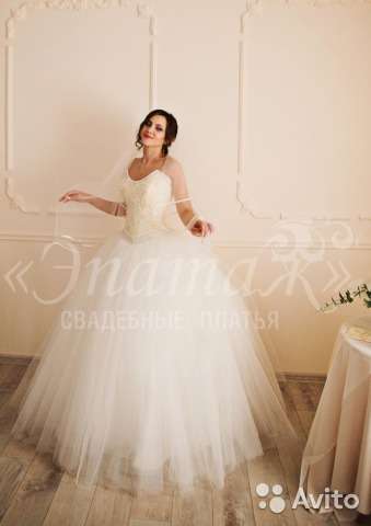 Свадебное платье цвет шампань, юбка фатин, корсет на шнуровке, украшен стразами и жемчужными бусинками. Красивое пышное платье, надевалось один раз, в идеальном состоянии, без химчистки, никаких пятен нет, с лентой для шнуровки корсета. Очень красиво смотрится. Корсет блестит. Кринолин и чехол в подарок. В комплекте с болеро. Свадебное болеро для невесты, цвет - айвори, кружевное, короткий рукавчик. Размер 52-54. Надевалось один раз, о/с, никаких пятен нет.