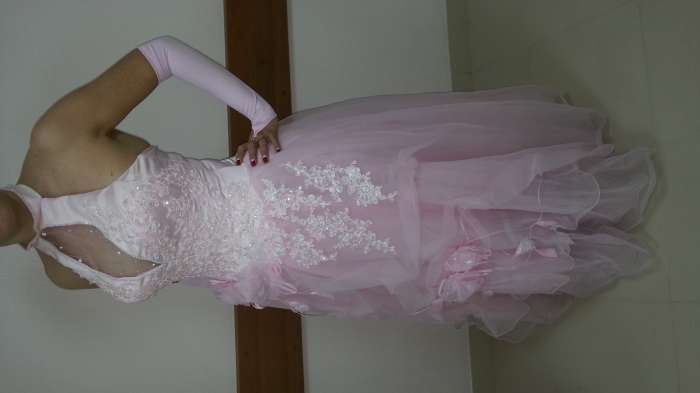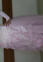 В этом платье хорошо смотрится грудь, удобно ходить в платье, грудь всегда "на месте", благодаря дизайну застёжка вокруг шеи - это элегантно и красиво. В подарок длинные розовые перчатки, длинная пышная фата, диадема, тени и помада фирмы Шанель розового цвета, украшения.