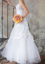 Покупалось на распродаже старой коллекции со скидкой 50% (изначальная цена 250 000 руб.) К нему есть подъюбник из жесткой сетки, есть кринолин 2 кольца. С кринолином будет очень пышно (но его края не будут видны за счет подъюбника из жесткой сетки), без кринолина (на фото без него) платье отлично держит форму за счет плотного подъюбника.