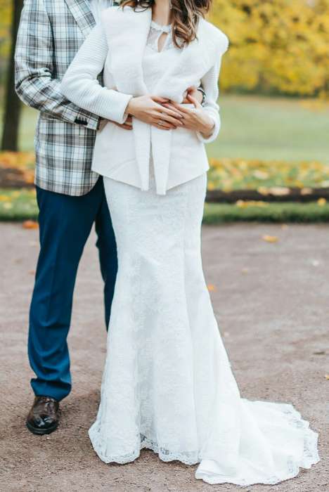 Цвет платья-айвори. Чехол в подарок. Есть шлейф, можно закрепить потайной пуговицей для удобства.