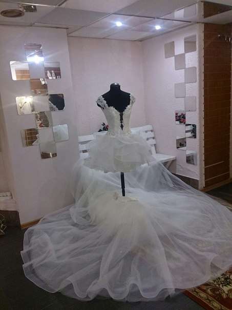 Платье в идеальном состоянии после химчистки. Платье-трансформер 3в1. Описание наряда: свадебное платье (короткое), пышная юбка, шлейф 2 м, фата. Материал: хлопок, сатин, фатин. Украшение: кружево, искусственный жемчуг, стразы сваровски. В подарок: чехол и 5 баллонов антистатика.