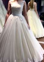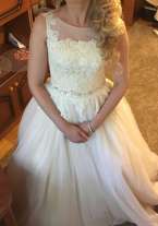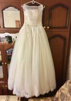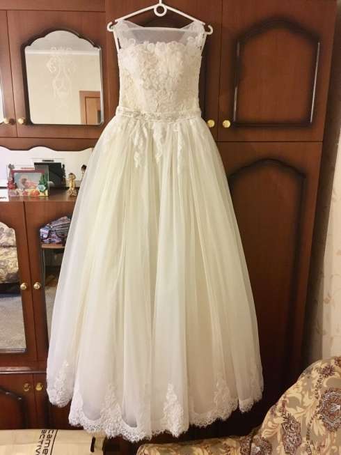 Продаю платье б/у, покупалось за 35 тыс. Продаю за 17 тыс. Надевалось один раз, размер 42-44, цвет айвори. Отличное состояние, после химчистки. Юбка пышная, верх и низ кружевной. На талии пояс украшен стразами, очень переливается на солнце. Торг уместен.
