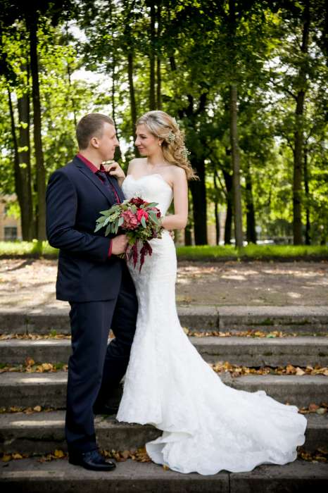 Кружевное свадебное платье, после химчистки, идеальное состояние. Удлиненный корсет на шнуровке, присутствует небольшой пуш-ап, шлейф можно поднять за петельку. Ткань плотная, кружевная.