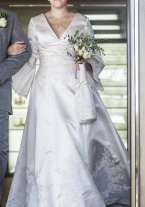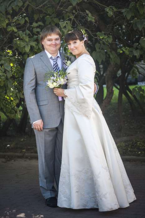 Платье с рукавами. Подойдет для невесты с полными руками и пышной грудью. Идеально для осенней-зимней свадьбы. Цвет айвори. Материал атлас, отделка кружевом по корсажу, рукавам и подолу. На шнуровке. Шилось по моему индивидуальному эскизу. В подарок отдам сумочку, и остаток кружева (можно будет украсить подушечку для колец).