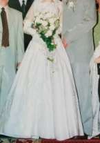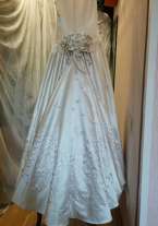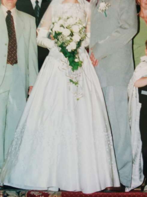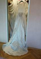 Атлас, цвет шампанское. Надевалось один раз, после этого отдавала в химчистку. Нежная вышивка по всему платью. Шлейф пристегивается на скрытую пуговку. Возможен торг.