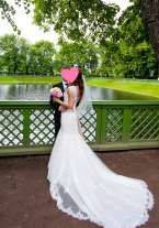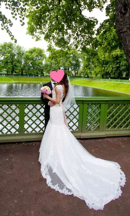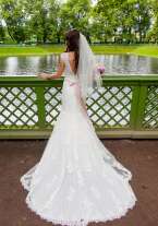 Изящное, нежное свадебное платье-рыбка американской марки Naviblue. Цвет: айвори. Кружевное платье со шлейфом, с V-образным вырезом на спине и красивой застежкой на пуговичках. Талию подчеркивает атласный пояс, спереди расшитый вручную стразами и стеклярусом. Очень удобное! При необходимости шлейф можно собрать и зафиксировать сзади на пуговичку (имеется маленькая петелька), либо на руке на петельку. Платье на рост примерно 168 см + 7 см каблук (+/-). В подарок новая (неношенная, не моя) фата.