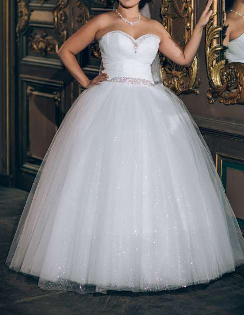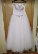 Продам шикарное свадебное платье после чистки, б/у 1 день. На рост 160-167см (я 160см, одевала туфли на танкетке +7см). Территориально примерка дом у метро Девяткино. В подарок отдам кринолин на 5 колец, шубку и перчатки!