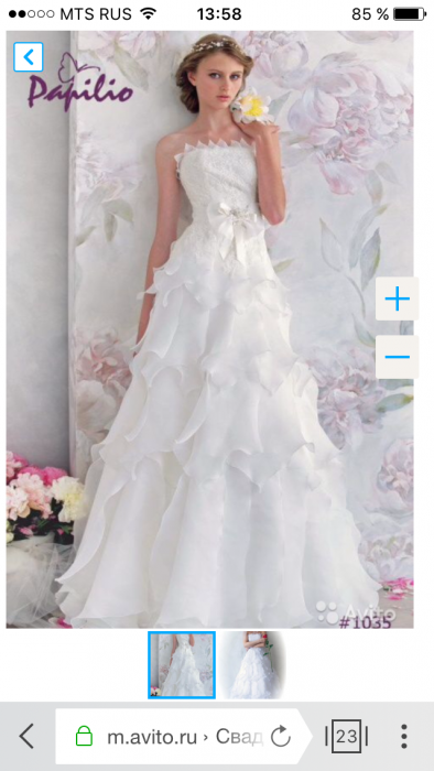 Продам шикарное платье Papilio. Подол платья состоит из множества "лепестков", есть небольшой шлейф, который убирается. Корсет на шнуровке, закрывается молнией. Думаю,что подойдет и на размер 40-42. Обхват бюста 88см, обхват бедер 96см, рост 170-175см (либо ниже+каблук). Платье, как новое (одето один раз) после евро.химчистки. В подарок отдам нижнюю юбку (без нее тоже красиво) на 2 кольца. Само платье стоило 35000р. Рядом с метро. Торг.