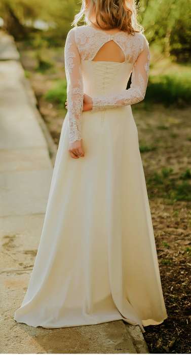 Свадебное кружевное платье. Цвет ivory. Длинные кружевные рукава, корсет. Состояние идеальное. На рост 160- 165 см + каблук. Покупала за 26 тыс.