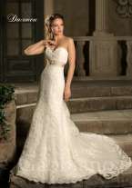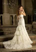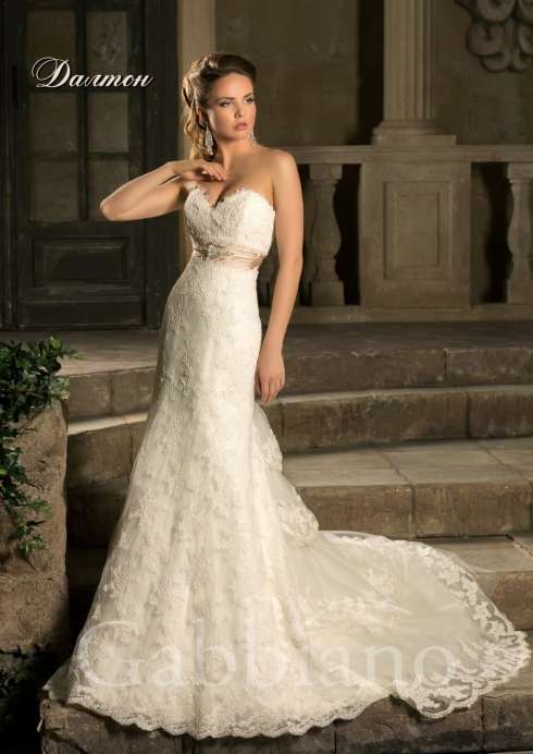 Свадебное платье силуэта «рыбка» покрыто слоем фактурного кружева с нежным цветочным рисунком. Оно образует фигурные края открытого лифа в форме сердечка и подчеркивает многослойность юбки, декорируя низ подола широкой ажурной полосой. Слегка завышенную линию талии выделяет пояс карамельного оттенка, декорированный горизонтальными складками ткани и объемной вышивкой из сверкающих белых бусин.