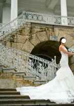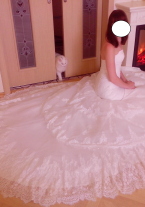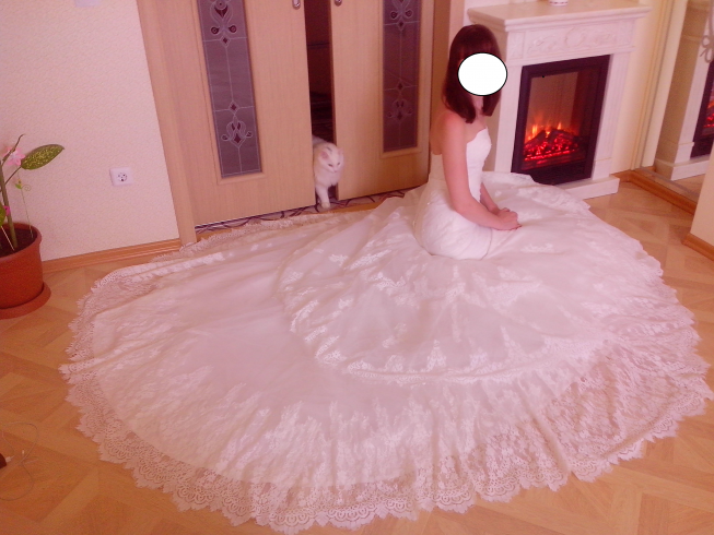 платье имеет шикарный кружевной шлейф, который по желанию можно "одеть" на руку, или пристегнуть на крючок, с помощью которого шлейф прячется под первым слоем.